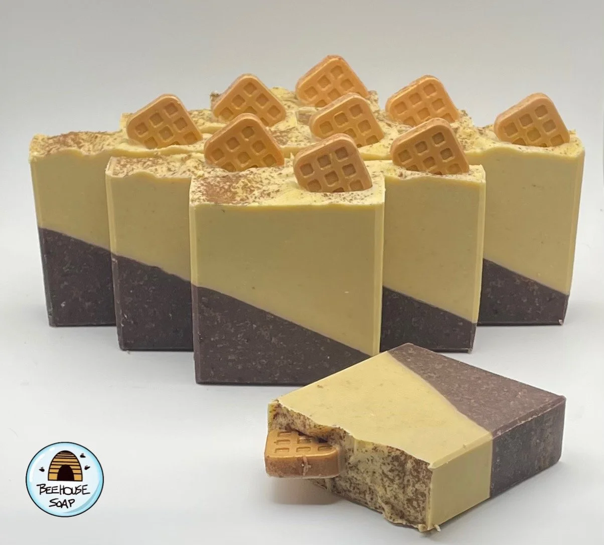 This soap is scented with cinnamon, cardamom, nutmeg, orange peel, honey, blackberry, sandalwood, tobacco and patchouli. Pumpkin puree and african black soap crumbs are in this creamy batter with a waffle and cinnamon sprinkle on top.