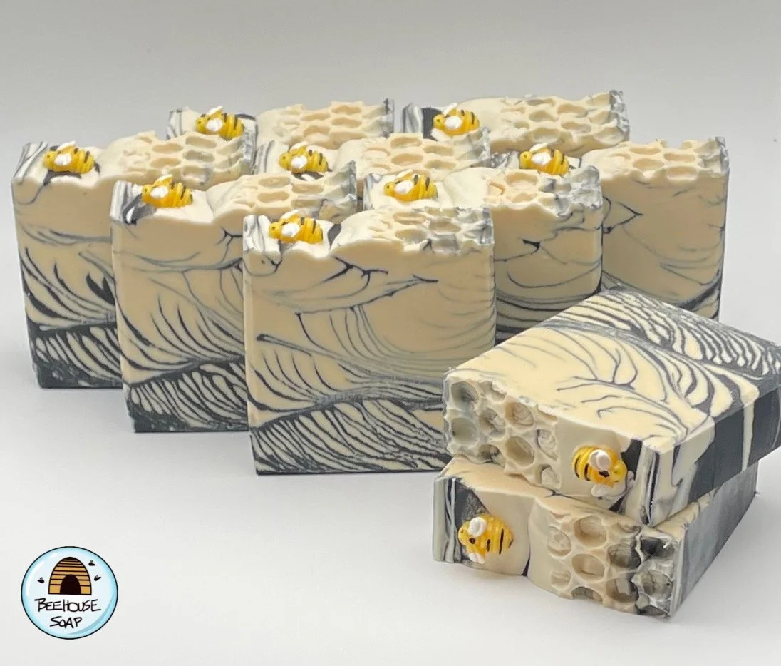 This soap is scented with wildflower, propolis and honey. A thin line swirl mimics the wings of a honey bee. A honeycomb pattern is pressed into the top with a single bee charm atop each bar.