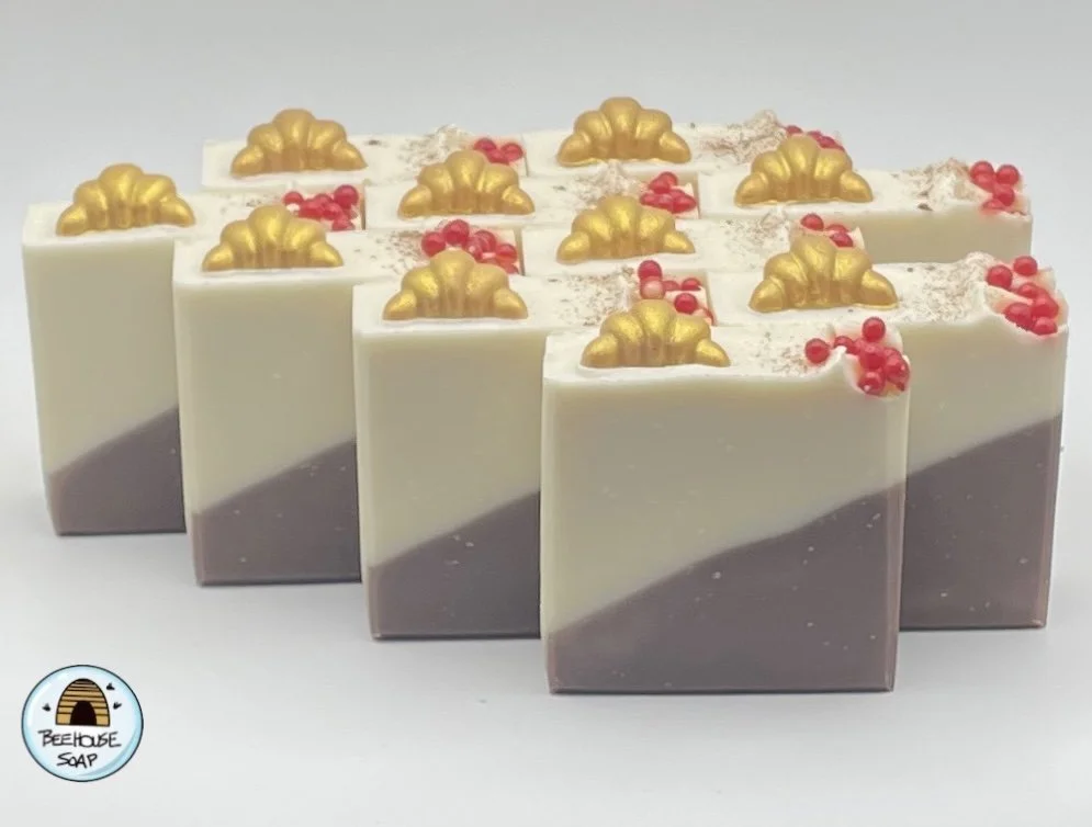 This soap is scented with apples, rose blossoms, cinnamon, caramel, pumpkin, cardamom, nutmeg and allspice. A golden croissant sits atop the batter with a sprinkle of cinnamon.